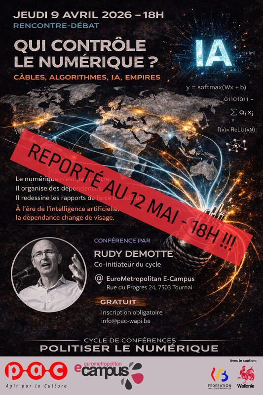 Derrière chaque clic, des câbles. Derrière chaque recommandation, des algorithmes. Derrière chaque décision, des intérêts et des rapports de force. Le numérique n’est pas neutre : il transforme nos sociétés et nos démocraties. Cette rencontre ouvre le cycle « Politiser le numérique » du PAC et de l'Eurometropolitan E-Campus pour comprendre ces enjeux et reprendre prise.